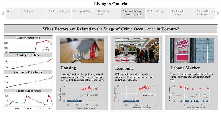 Together, these dashboards offer viewers a dynamic and multifaceted perspective on Toronto’s crime landscape. Beyond understanding the severity of recent crime trends, users can also explore potential contributing factors through contextual data relationships.