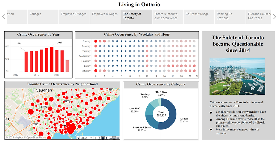 This personal project showcases two Tableau dashboards developed by Yi-Chen Hsiao, originally created as part of a broader group project exploring various aspects of life in Ontario. While the full group project has a larger scope, this portfolio piece focuses exclusively on one topic—crime analysis in Toronto—presented through a Tableau story.